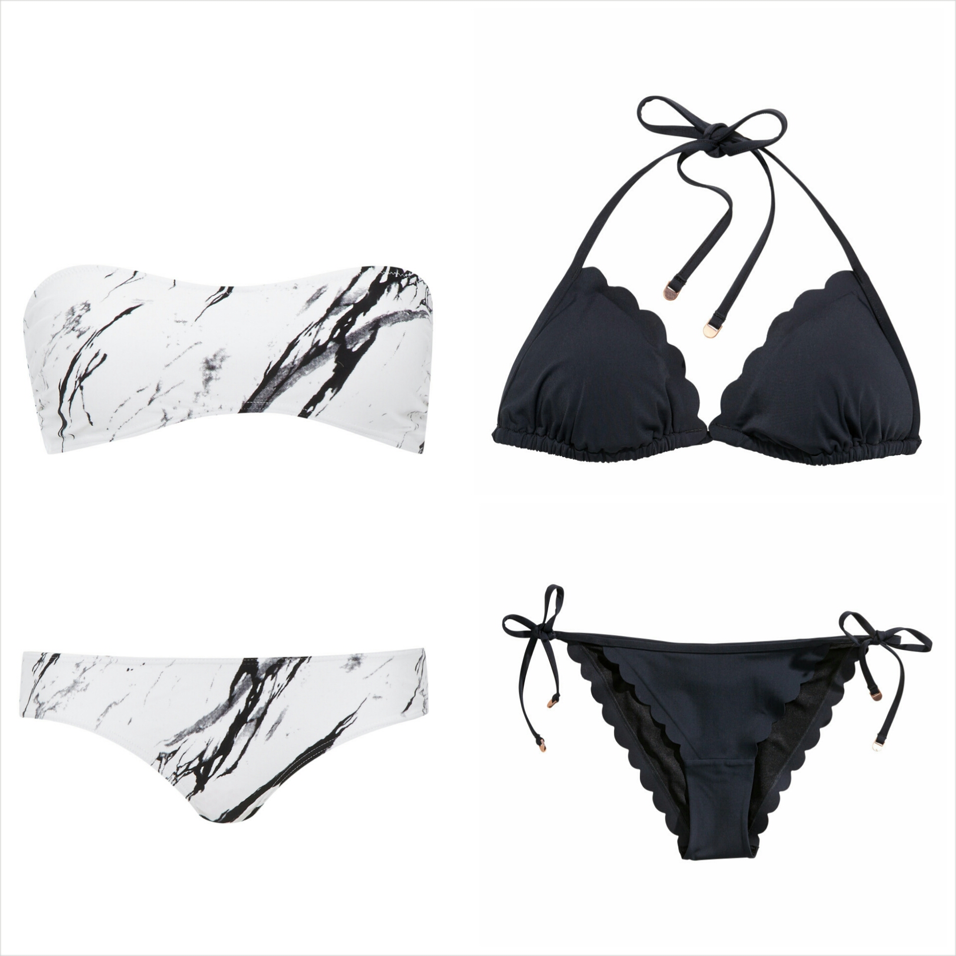 Striped bikini top by Cos (title image, matching briefs available), marble bandeau bikini by Björn Borg and black scallop edge triangle bikini at H&M (removable padding)