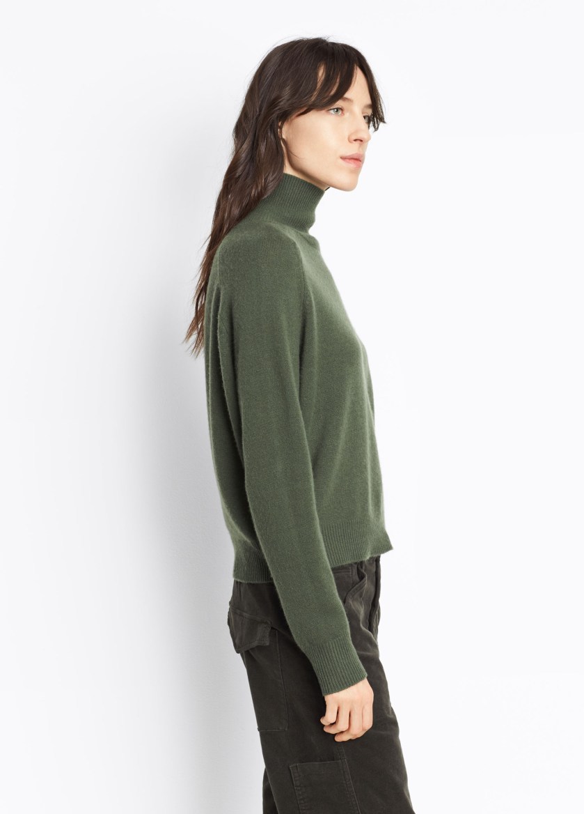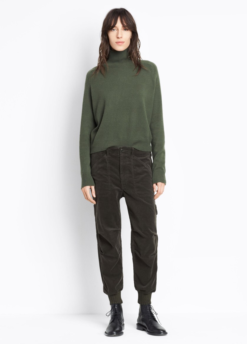 Army green knit, slouchy pants and boots (nowhere to be found on the website), all at Vince